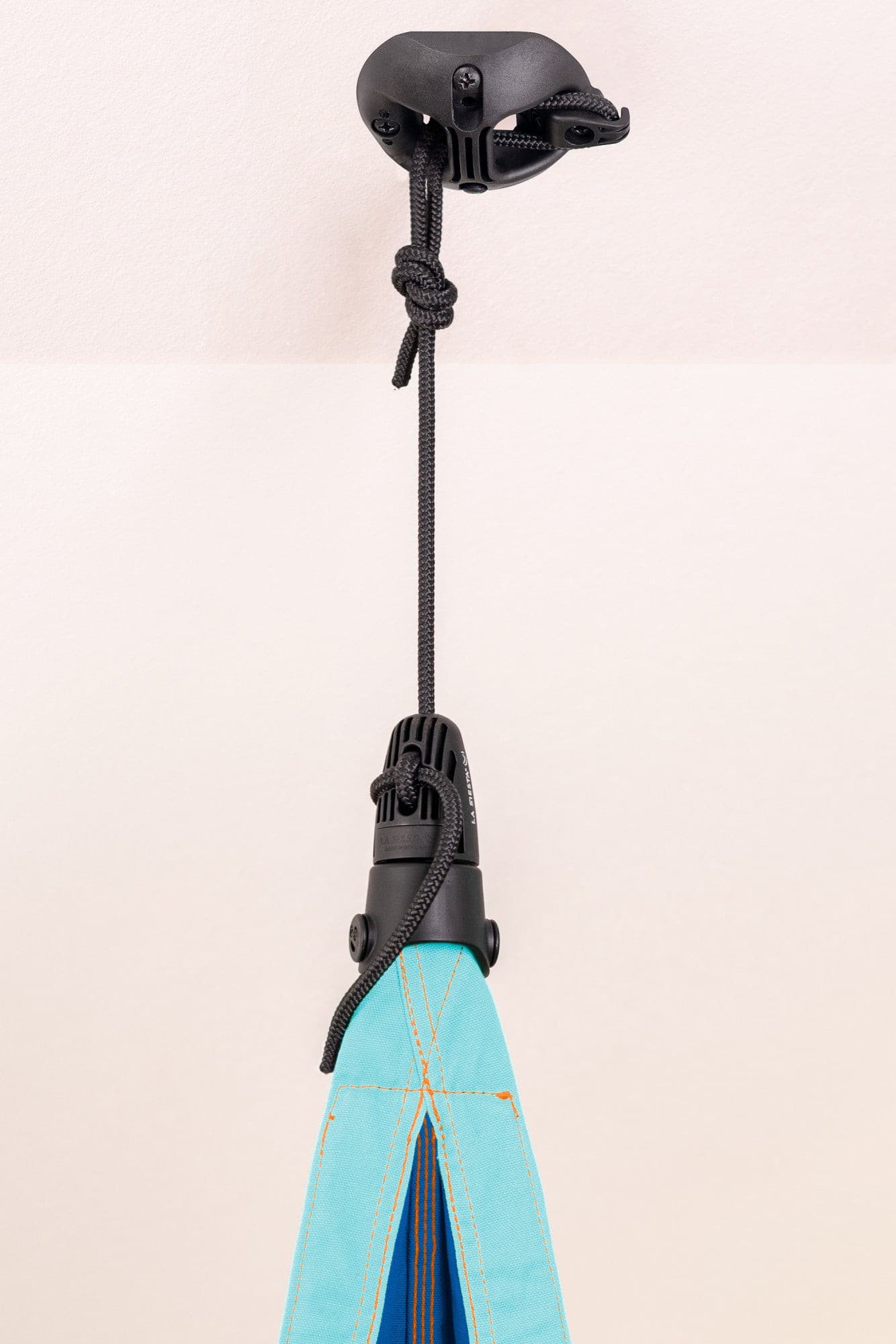 The MultiSpot developed by LA SIESTA is patented and TÜV-tested. With this integrated suspension the Joki children's hanging nest can be put up and taken down in seconds. It provides reliable suspension from all common ceiling types and beams.