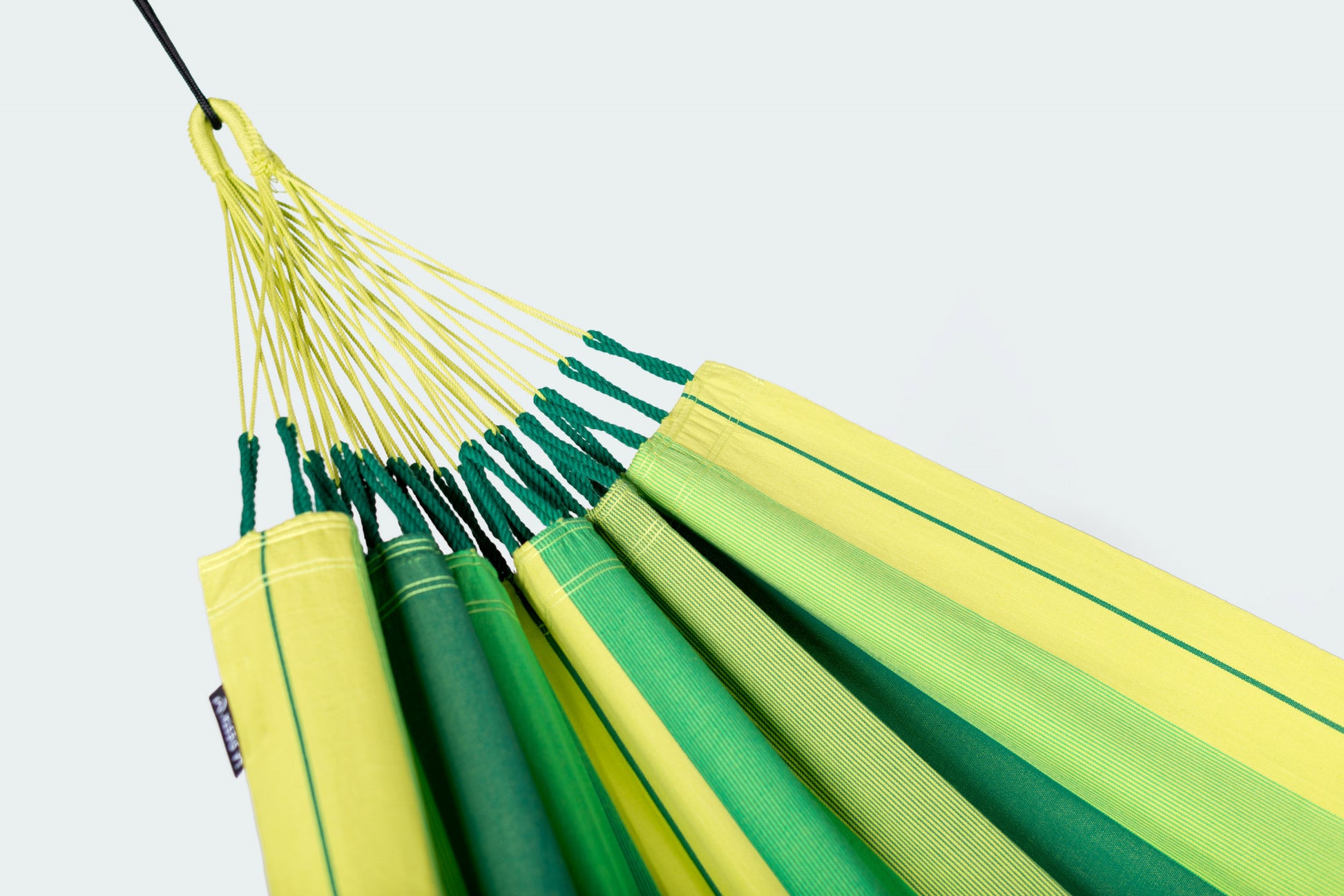 In Colombia, our hammocks are made from high-quality materials that reflect the joy of South American life and help you forget your worries:Our hammock experts carefully weave fabric with refined patterns and lovingly knot the many suspension cords by hand into the typical Colombian loop, the cabezal.