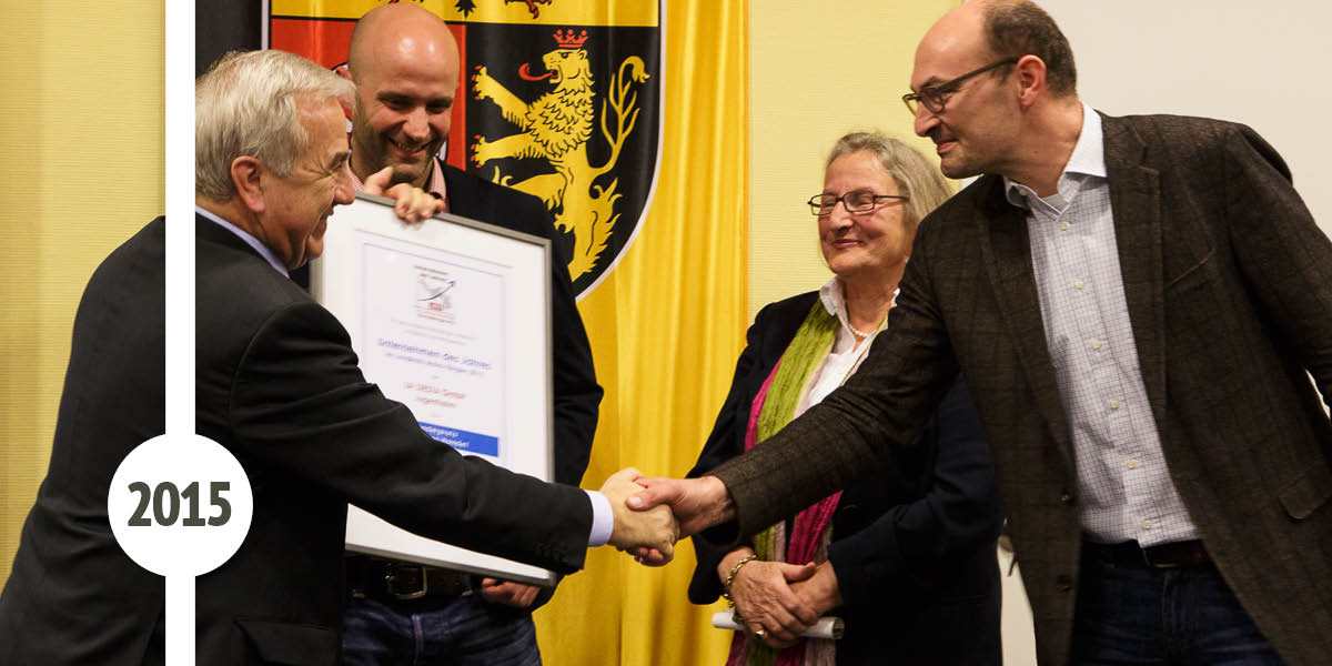 Im Jahr 2015 nehmen wir den Sonderpreis Fairer Handel, der uns durch den Landkreis Mainz-Bingen überreicht wird, entgegen. In seiner Laudatio würdigt Landrat Klaus Schick das Engagement von LA SIESTA in Sachen Nachhaltigkeit und geht dabei auch auf den Umgang mit unseren Zulieferbetrieben in Indien, Kolumbien, Brasilien und Polen ein.