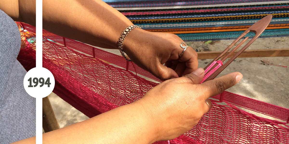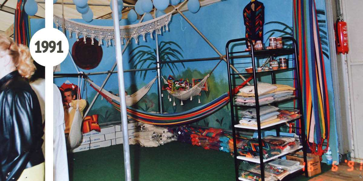 Am 16. März 1991 war es soweit, unsere Gründer verkauften ihre erste Hängematte auf der Rheinland-Pfalz-Ausstellung in Mainz. Der Hängematten-Stand war ein bunt dekoriertes Baugerüst aus Stahl, die Hängematten konnten präsentiert und direkt von den Kunden ausprobiert werden. Neben den Hängematten wurden anfangs auch Pullover und andere Kunsthandwerksprodukte aus Lateinamerika angeboten.