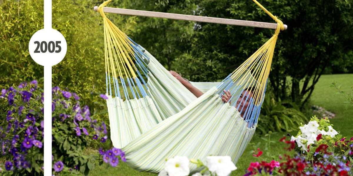 Im Jahr 2005 bringt LA SIESTA den weltweit ersten Hängesessel in XXL-Format auf den Markt. Der Lounger ist bis heute dank einer Stockbreite von 140 cm und einer Sitzteillänge von 210 cm so bequem wie kein anderer Hängesessel seiner Art.