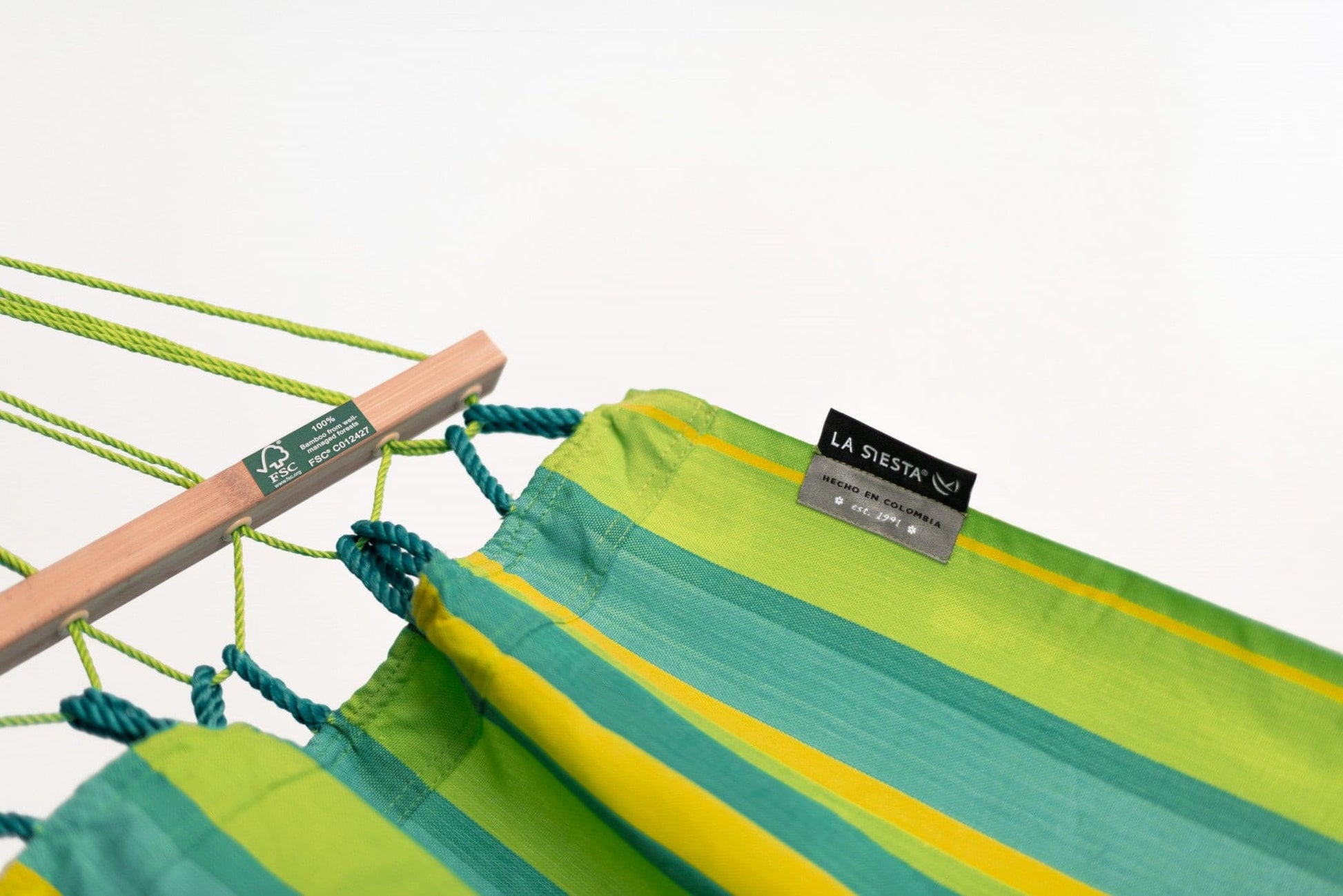 Unsere Hängemattenexpert*innen weben mit besonderer Sorgfalt das Tuch mit seinen farbenfrohen Mustern und knüpfen die vielen Aufhängeschnüre in liebevoller Handarbeit zu der typisch kolumbianischen Schlaufe, der Cabezal.